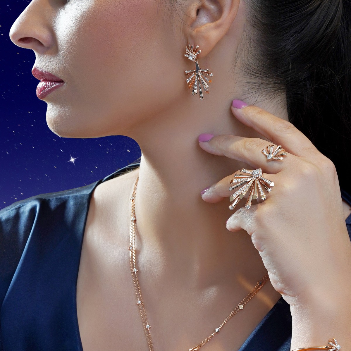 Inspired by the constellation that has one of the brightest stars Canopus. The star and its constellation have a striking linear shape, which is used as the inspiration for this collection. A radiant and expressive collection that uses 18K Rose Gold as a warm undertone with a center motif of IGI-certified Princess-cut White Diamonds surrounded by linear lines that depict the magnetic shape of the star and constellation.